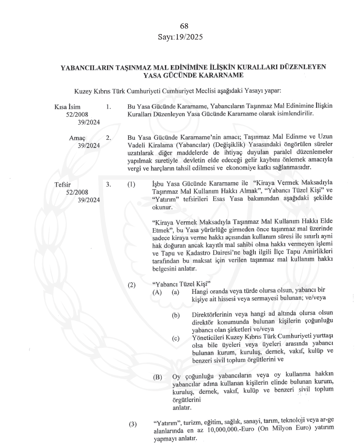 Yabancıların taşınmaz mal edinimine ilişkin kuralları düzenleyen yasa gücünde kararname için tıklayınız. İndirmek İçin Tıklayınız