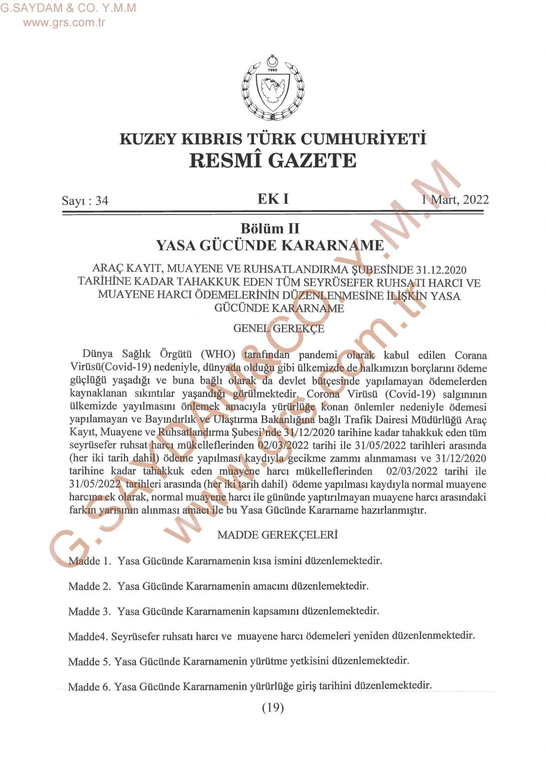 Araç kayıt, muayene ve ruhsatlandırma şubesinde 31.12.2020 tarihine kadar tahakkuk eden tüm seyrüsefer ruhsatı harcı ve muayene harcı ödemelerinin düzenlenmesine ilişkin yasa gücünde kararnameyle ilgili detayları aşağıda bulabilirsiniz.