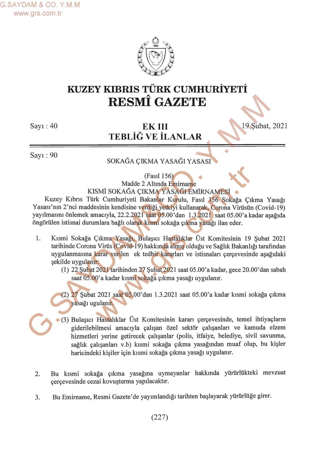 19.02.2021 Tarih ve 40 Sayılı Resmi Gazetede Yayınlanarak yürürlüğe giren Sokağa Çıkma Yasağı Yasası altında Kısmi Sokağa Çıkma Yasağı Emirnamesi ile belirlenen açık ve kapalı olacak işyerleri ile hangi şartlarda açık olacağı belirtilmiştir.