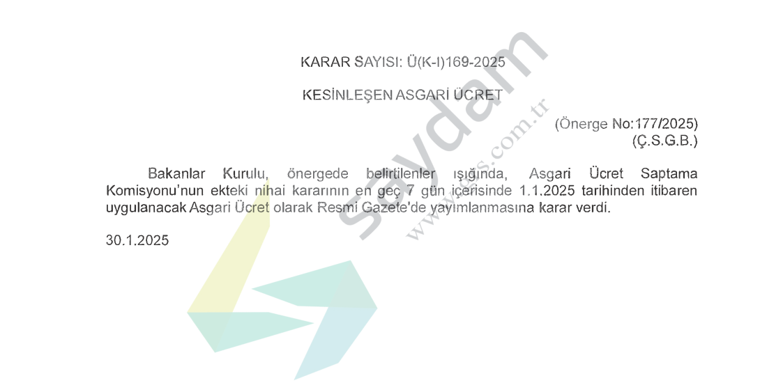 30.01.2025 Tarih ve 21 Sayılı Resmi Gazetede Bakanlar Kurulunun Ü (K-I) 169-2025 Sayılı Kararı ile 01.01.2025 Tarihinden itibaren geçerli olmak üzere Asgari Ücret aylık brüt 43.469 TL olarak belirlenmiş ve Resmi Gazetede yayınlanarak 01.01.2025 tarihi itibariyle yürürlüğe girmiştir.