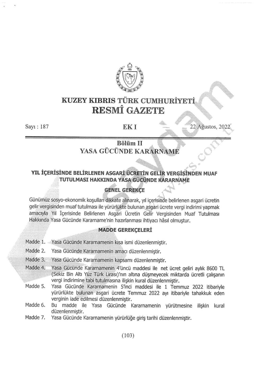 Asgari Ücretten Vergi Alınmayacağına Dair Yasa Gücünde Kararname 22.08.2022 Tarih ve 187 No’lu Resmi Gazetede yayınlanarak yürürlüğe girmiştir.