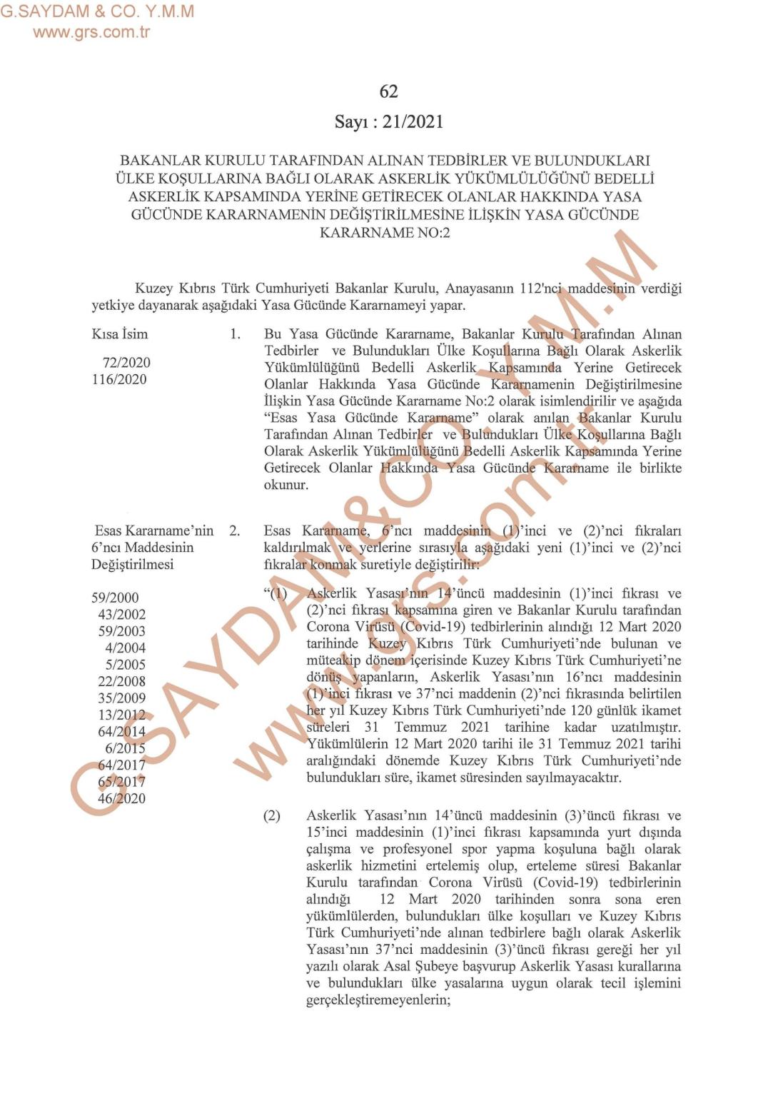 RG S.62 EK I 16 Mart 2021 tarihli Resmi Gazetede;Kuzey Kıbrıs Türk Cumhuriyeti Bakanlar Kurulu, Anayasanın 112’nci maddesinin verdiği yetkiye dayanarak aşağıdaki Yasa Gücünde Kararnameyi yapar.