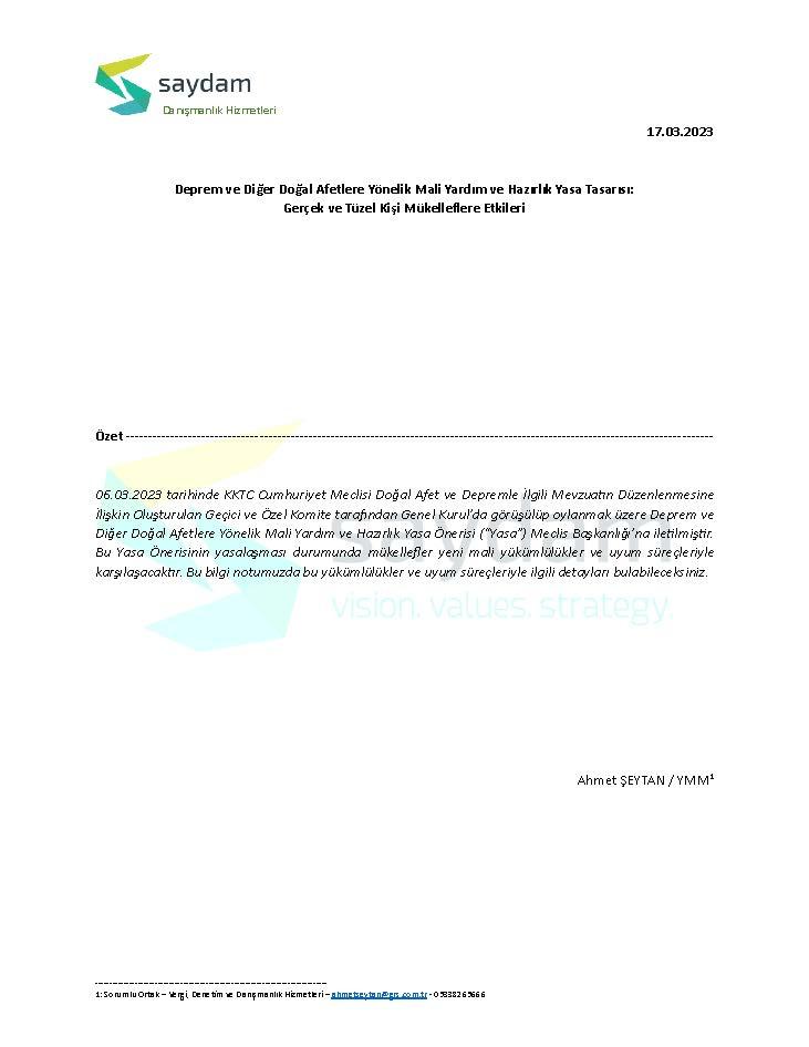6.03.2023 tarihinde KKTC Cumhuriyet Meclisi Doğal Afet ve Depremle İlgili Mevzuatın Düzenlenmesine İlişkin Oluşturulan Geçici ve Özel Komite tarafından Genel Kurul’da görüşülüp oylanmak üzere Deprem ve Diğer Doğal Afetlere Yönelik Mali Yardım ve Hazırlık Yasa Önerisi (“Yasa”) Meclis Başkanlığı’na iletilmiştir. Bu Yasa Önerisinin yasallaşması durumunda mükellefler yeni mali yükümlülükler ve uyum süreçleriyle karşılaşacaktır. Bu bilgi notumuzda bu yükümlülükler ve uyum süreçleriyle ilgili detayları bulabileceksiniz.Görsel kaldırıldı.Görsel kaldırıldı.Görsel kaldırıldı.Görsel kaldırıldı.Görsel kaldırıldı.