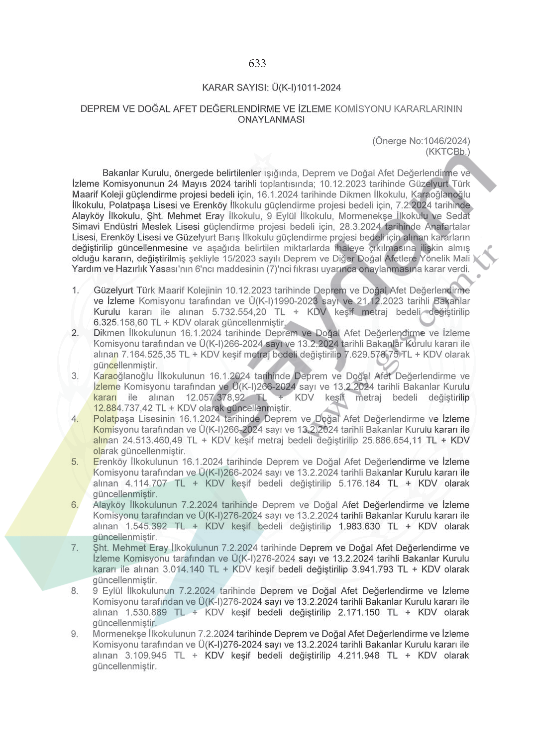 Bakanlar Kurulu, önergede belirtilenler ışığında, Deprem ve Doğal Afet Değerlendirme ve izleme Komisyonunun 24 Mayıs 2024 tarihli toplantısında; 10.12.2023 tarihinde Güzelyurt Türk Maarif Koleji güçlendirme projesi bedeli için, 16.1.2024 tarihinde Dikmen ilkokulu, Karaoğlanoğlu ilkokulu, Polatpaşa Lisesi ve Erenköy ilkokulu güçlendirme projesi bedeli için, 7.2.2024 tarihinde Alayköy ilkokulu, Şht. Mehmet Eray ilkokulu, 9 Eylül ilkokulu, Mormenekşe ilkokulu ve Sedat Simavi Endüstri Meslek Lisesi güçlendirme projesi bedeli için, 28.3.2024 tarihinde Anafartalar Lisesi, Erenköy Lisesi ve Güzelyurt Barış ilkokulu güçlendirme projesi bedeli için alınan kararların değiştirilip güncellenmesine ve aşağıda belirtilen miktarlarda ihaleye çıkılmasına ilişkin almış olduğu kararın, değiştirilmiş şekliyle 15/2023 sayılı Deprem ve Diğer Doğal Afetlere Yönelik Mali Yardım ve Hazırlık Yasası’nın 6’ncı maddesinin (7)’nci fıkrası uyarınca onaylanmasına karar verdi.
