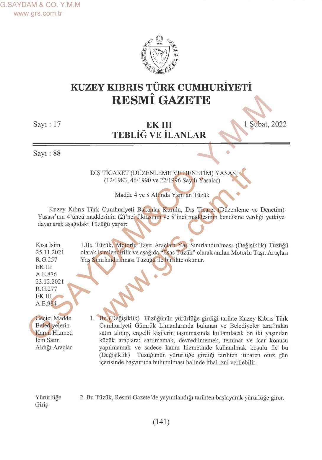 Kuzey Kıbrıs Türk Cumhuriyeti Bakanlar Kurulu, Dış Ticaret (Düzenleme ve Denetim) Yasası’nın 4’üncü maddesinin 2’nci fıkrasının ve 8’inci maddesinin kendisine verdiği yetkiye dayanarak aşağıdaki Tüzüğü yapar.
