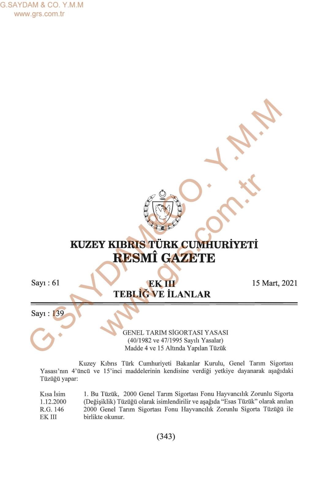 RG S.61 EK III 15 Mart 2021 tarihli Resmi Gazetede;Kuzey Kıbrıs Türk Cumhuriyeti Bakanlar Kurulu, Genel Tarım Sigortası Yasası’nın 4’üncü ve 15’inci maddelerinin kendisine verdiği yetkiye dayanarak aşağıdaki Tüzüğü yapar.