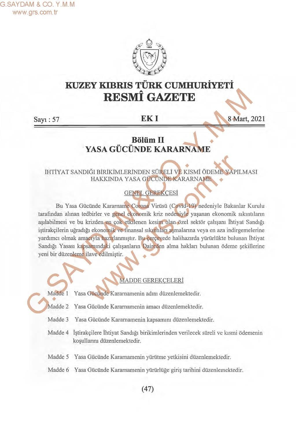 RG S.57 Ek I Bölüm II 8 Mart 2021 Tarihli Resmi Gazetede yayınlanarak yürürlüğe giren;