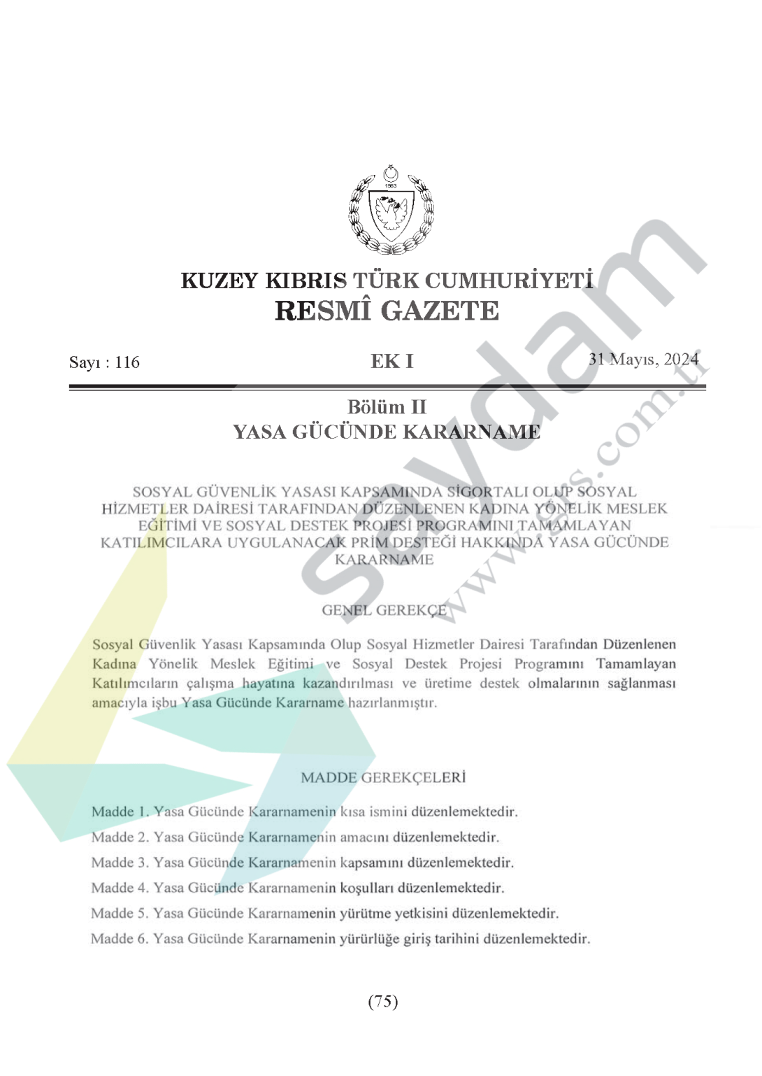 Sosyal Güvenlik Yasası Kapsamında Olup Sosyal Hizmetler Dairesi Tarafından Düzenlenen Kadına Yönelik Meslek Eğitimi ve Sosyal Destek Projesi Programını Tamamlayan Katılımcıların çalışma hayatına kazandırılması ve üretime destek olmalarının sağlanması amacıyla işbu Yasa Gücünde Kararname hazırlanmıştır.Görsel kaldırıldı.Görsel kaldırıldı.Görsel kaldırıldı.Görsel kaldırıldı.Görsel kaldırıldı.Görsel kaldırıldı.Görsel kaldırıldı.