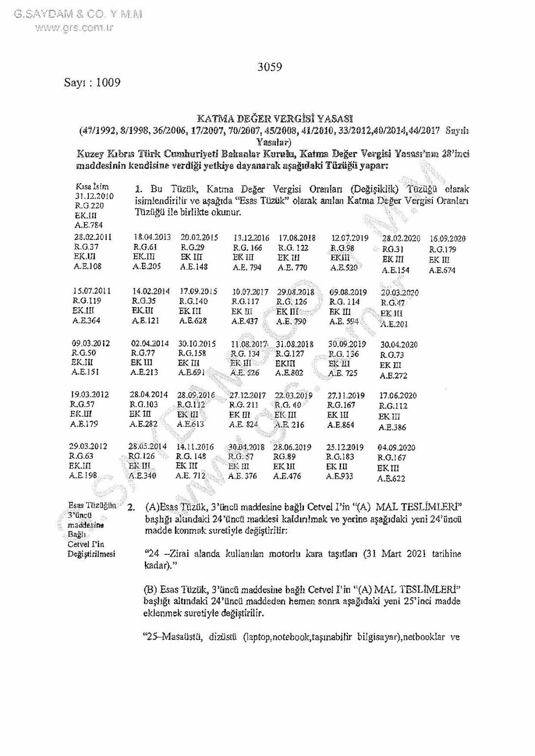 RG S.239 EK III 31 Aralık 2020 tarihli Resmi Gazetede;Kuzey Kıbrıs Türk Cumhuriyeti Bakanlar Kurulu, Katma Değer Vergisi Yasası’nın 23’üncü maddesinin kendisine verdiği yetkiye dayanarak aşağıdaki Tüzüğü yapar: