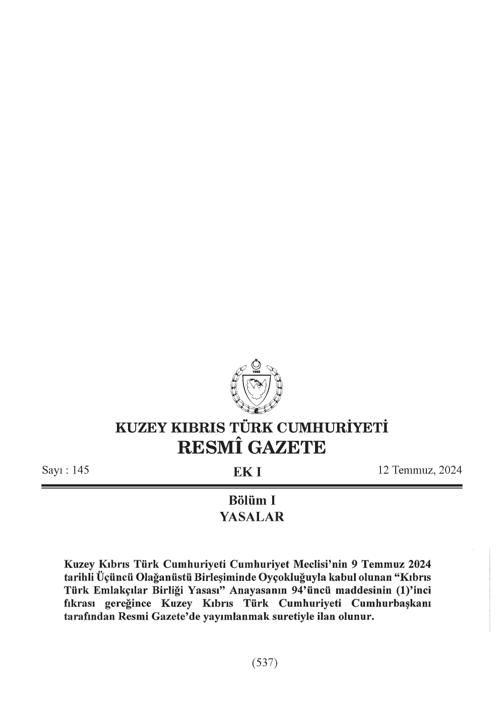 Kuzey Kıbrıs Türk Cumhuriyeti Cumhuriyet Meclisi’nin 9 Temmuz 2024 tarihli Üçüncü Olağanüstü Birleşiminde Oyçokluğuyla kabul olunan “Kıbrıs Türk Emlakçılar Birliği Yasası” Anayasanın 94’üncü maddesinin (1)’inci fıkrası gereğince Kuzey Kıbrıs Türk Cumhuriyeti Cumhurbaşkanı tarafından Resmi Gazete’de yayımlanmak suretiyle ilan olunur.![]()