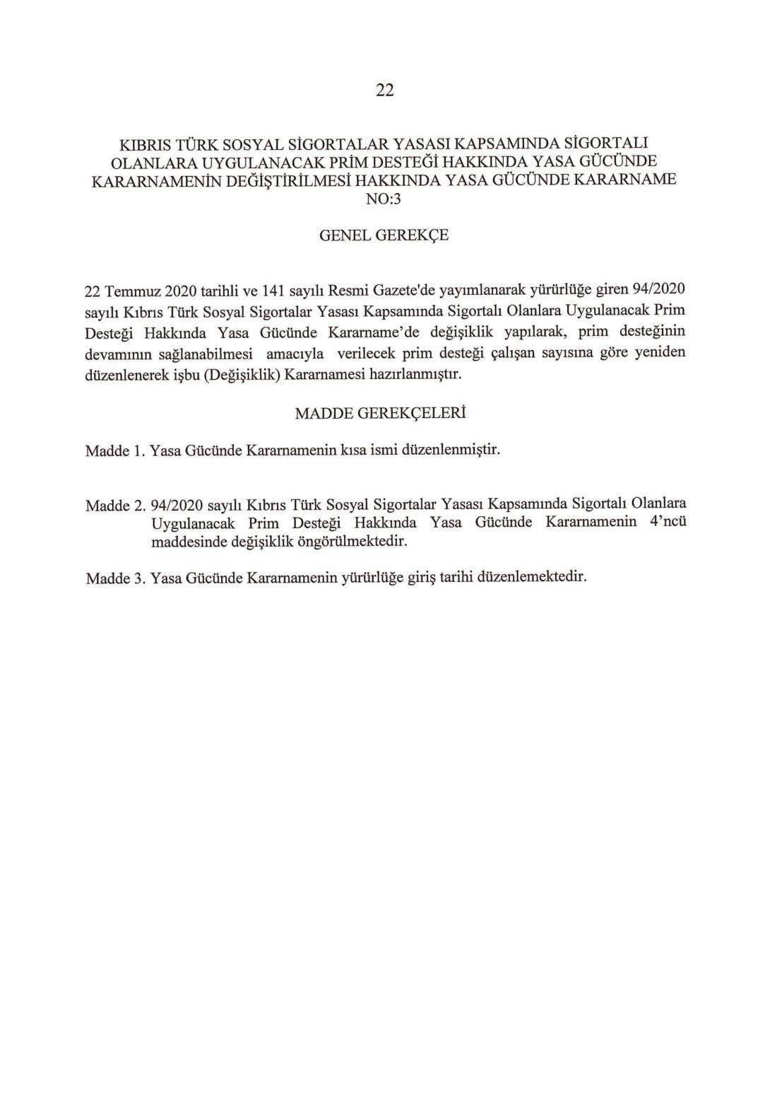 22 Temmuz 2020 tarihli ve 141 sayılı Resmi Gazete’de yayımlanarak yürürlüğe giren 94/2020 sayılı Kıbrıs Türk Sosyal Sigortalar Yasası Kapsamında Sigortalı Olanlara Uygulanacak Prim Desteği Hakkında Yasa Gücünde Kararname’de değişiklik yapılarak, prim desteğinin devamının işbu (Değişiklik) Kararnamesi hazırlanmıştır.