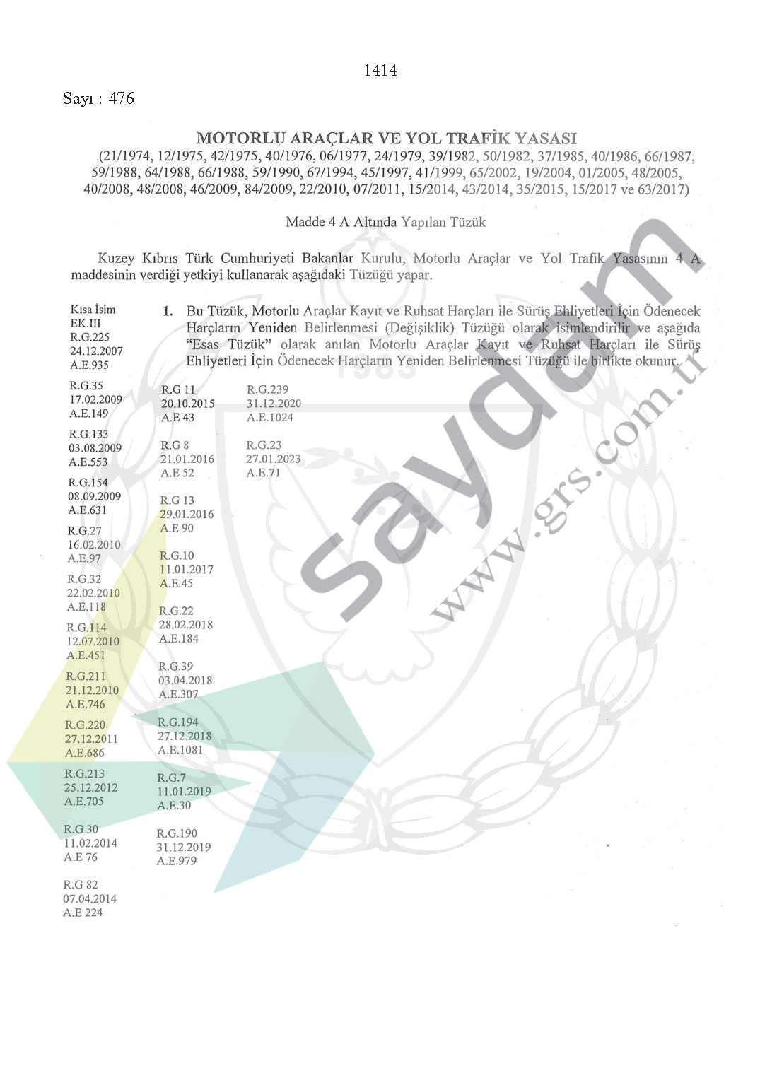 Kuzey Kıbrıs Türk Cumhuriyeti Bakanlar Kurulu, Motorlu Araçlar ve Yol Trafik Yasasının 4 A maddesinin verdiği yetkiyi kullanarak aşağıdaki Tüzüğü yapar.