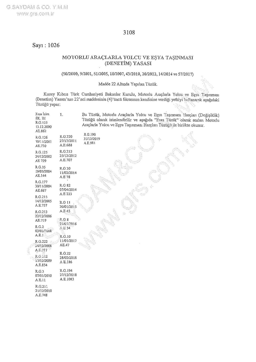 Kuzey Kıbrıs Türk Cumhuriyeti Bakanlar Kurulu, Motorlu Araçlarla Yolcu ve Eşya Taşınması (Denetim) Yasası’nın 22’nci maddesinin (4)’üncü fıkrasının kendisine verdiği yetkiyi kullanarak aşağıdaki Tüzüğü yapar: