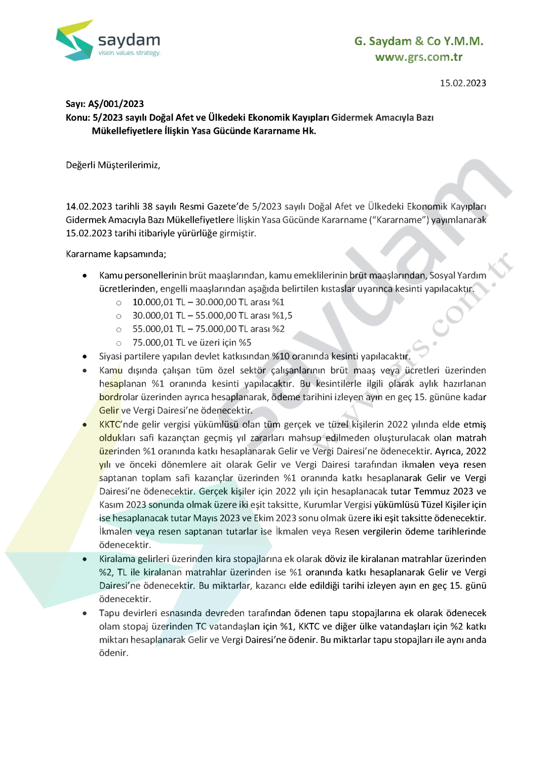 14.02.2023 tarihli 38 sayılı Resmi Gazete’de 5/2023 sayılı Doğal Afet ve Ülkedeki Ekonomik Kayıpları Gidermek Amacıyla Bazı Mükellefiyetlere İlişkin Yasa Gücünde Kararname (“Kararname”) yayımlanarak 15.02.2023 tarihi itibariyle yürürlüğe girmiştir.