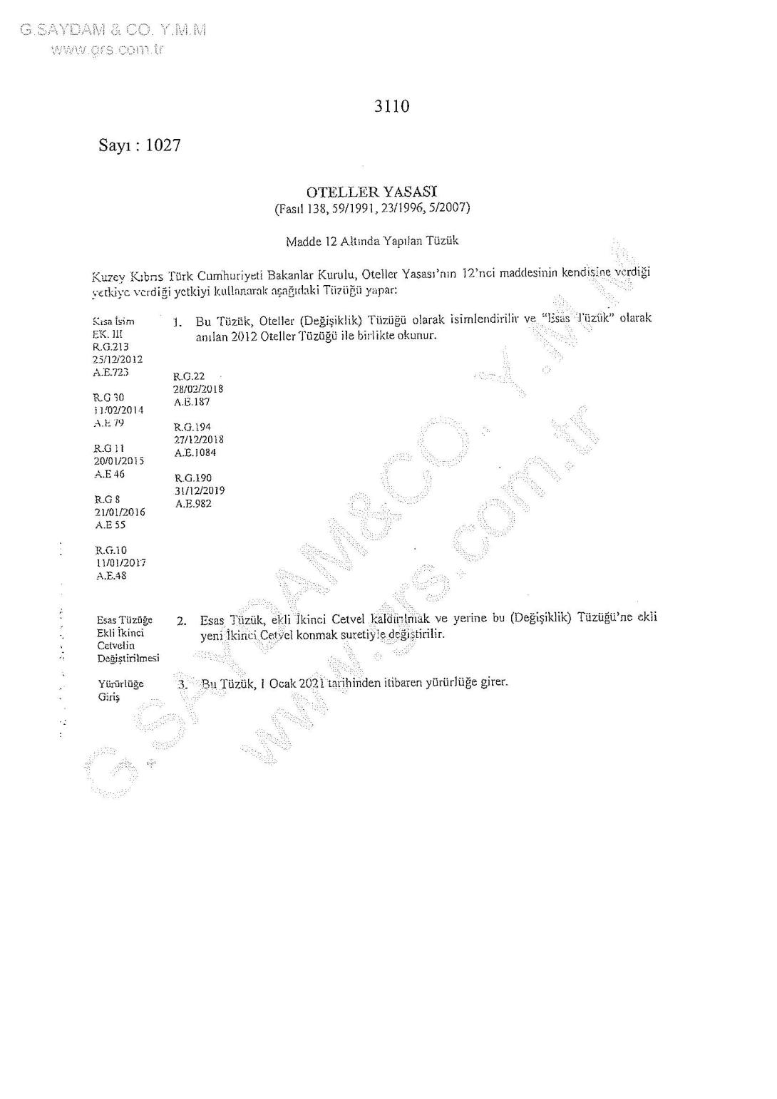 RG S.239 EK III 31 Aralık 2020 tarihli Resmi Gazetede;Kuzey Kıbrıs Türk Cumhuriyeti Bakanlar Kurulu, Oteller Yasası’nın 12’nci maddesinin kendisine verdiği yetkiyi kullanarak aşağıdaki Tüzüğü yapar: