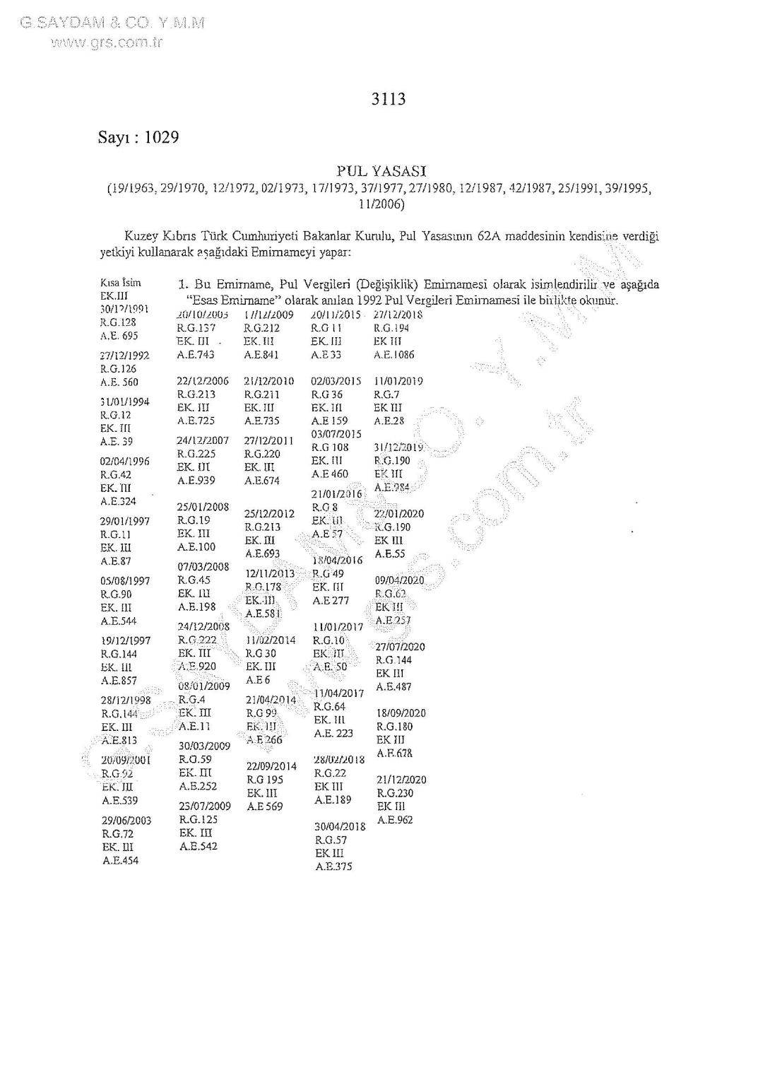 RG S.239 EK III 31 Aralık 2020 tarihli Resmi Gazetede;Kuzey Kıbrıs Türk Cumhuriyeti Bakanlar Kurulu, Pul Yasasının 62A maddesinin kendisine verdiği yetkiyi kullanarak aşağıdaki Emirnameyi yapar: