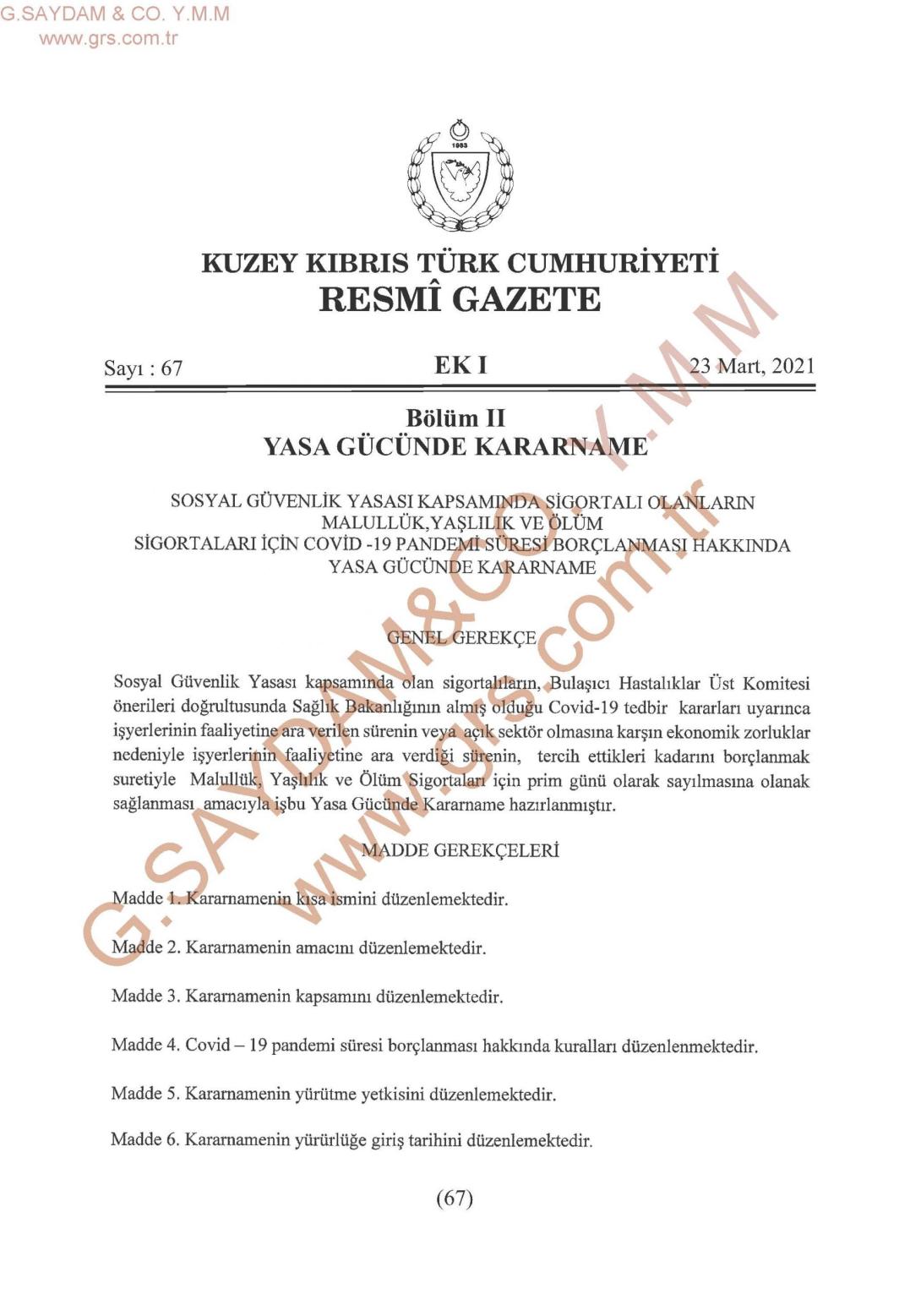 Sosyal Güvenlik Yasası kapsamında olan sigortalıların, Bulaşıcı Hastalıklar Üst Komitesi önerileri doğrultusunda Sağlık Bakanlığının almış olduğu Covid-19 tedbir kararları uyarınca işyerlerinin faaliyetine ara verilen sürenin veya açık sektör olmasına karşın ekonomik zorluklar nedeniyle işyerlerinin faaliyetine ara verdiği sürenin, tercih ettikleri kadarını borçlanmak suretiyle Malullük, Yaşlılık ve Ölüm Sigortaları için prim günü olarak sayılmasına olanak sağlanması amacıyla işbu Yasa Gücünde Kararname hazırlanmıştır.![]()