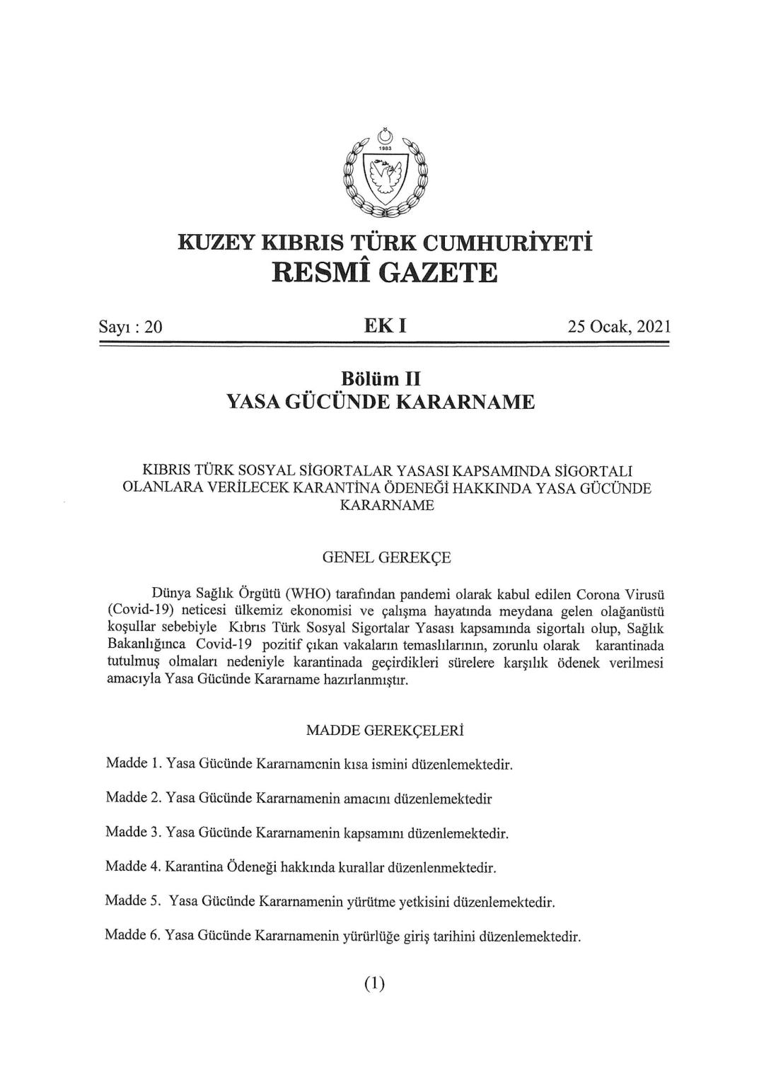 Covid 19’a yakalanan ve/veya temaslı olarak karantinaya alınan Sigortalı kişilere ücret ödenmesi 25.01.2021 Tarih ve 20 Sayılı Resmi Gazetede yayınlanarak yürürlüğe girmiştir.